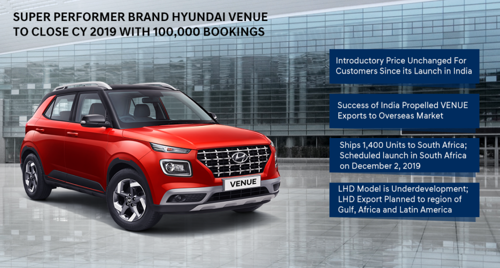 Hyundai Motor India announced that the Super Performer Brand Hyundai VENUE is all set to close the Calendar year 2019 with 100,000 Bookings.