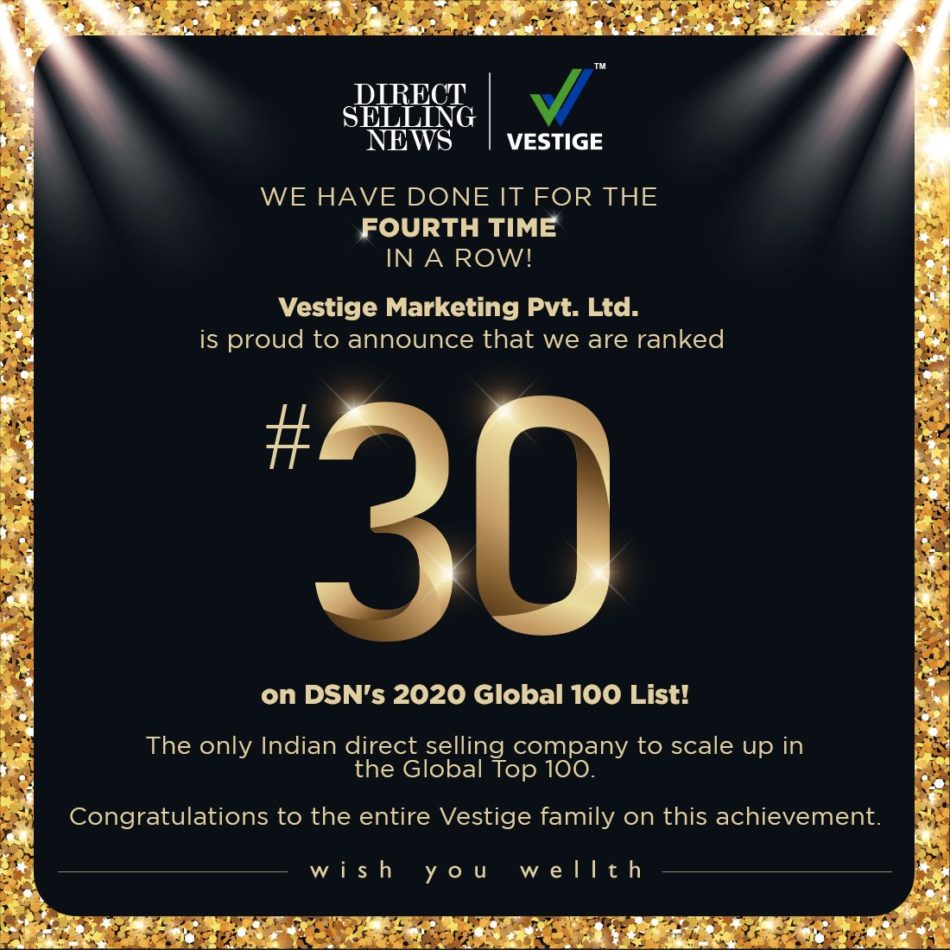 Vestige Marketing Pvt. Ltd. has been ranked 30 among the top 100 global direct selling companies – up 33 ranks from 63 in 2019 – on the DSN Global 100 List. Vestige has featured in the DSN Global 100 list for the fourth consecutive year and it is the only Indian direct selling company to scale up in the 2020 DSN Global 100 list this year.